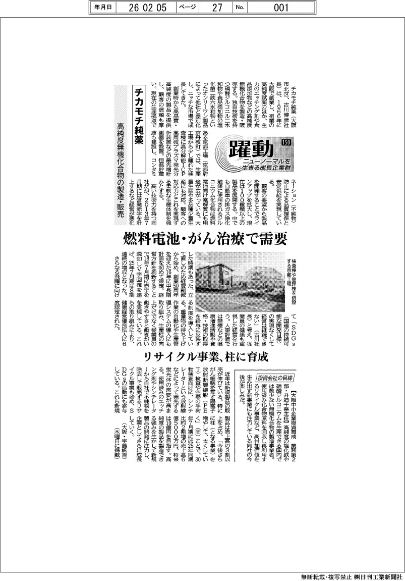 2月5日付の日刊工業新聞に弊社の記事が載りました。「躍動 ニューノーマルを生きる成長企業群」というコラムの記念すべき第150号で、弊社が大きく紹介されました。昭和41年(西暦1966年)に大阪の地で創業し、本年60周年を迎えました。これもひとえに皆様方の多大なるご支援の賜物と感謝申し上げます。丁度そのタイミングで日刊工業新聞に取り上げてもらい、社員一同喜びの気持ちで一杯です。小さくてもきらりと輝く会社として、今後とも存在し続けたいと思います。