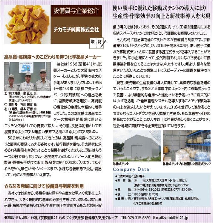 京都府産業支援センター、公益財団法人京都産業21、京都府中小企業技術センターが定期的に発刊する「クリエイティブ京都M&T」の企業紹介で、弊社が導入した設備が紹介されました。