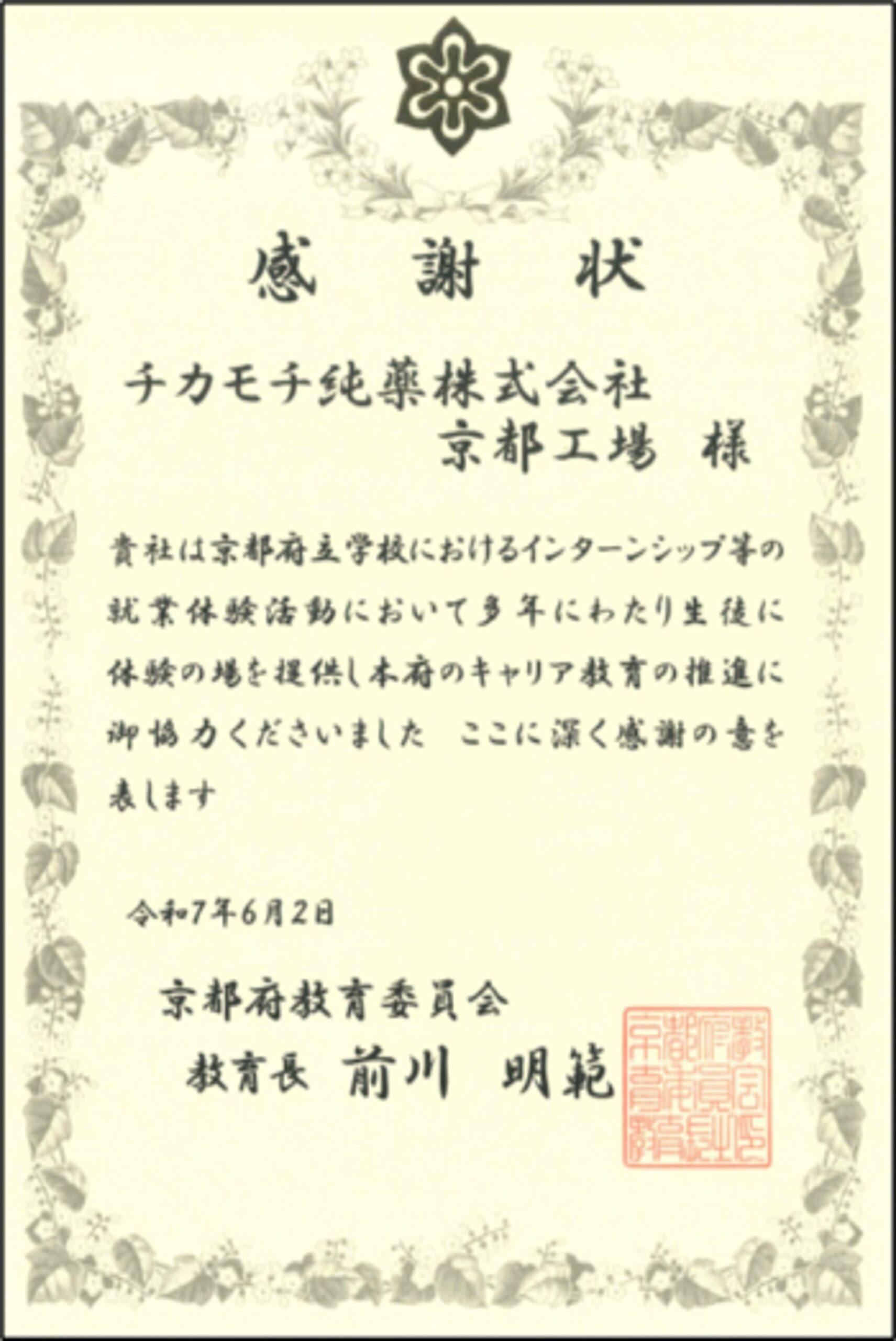 この度、弊社は京都府教育委員会から感謝状を頂きました。地元の須知高等学校からのインターンシップ生の受入と同校でのキャリアアップ講座に協力したことに対するものだそうです。少しでも地域に貢献できれば望外の喜びです。
